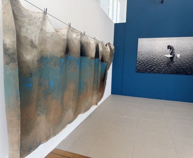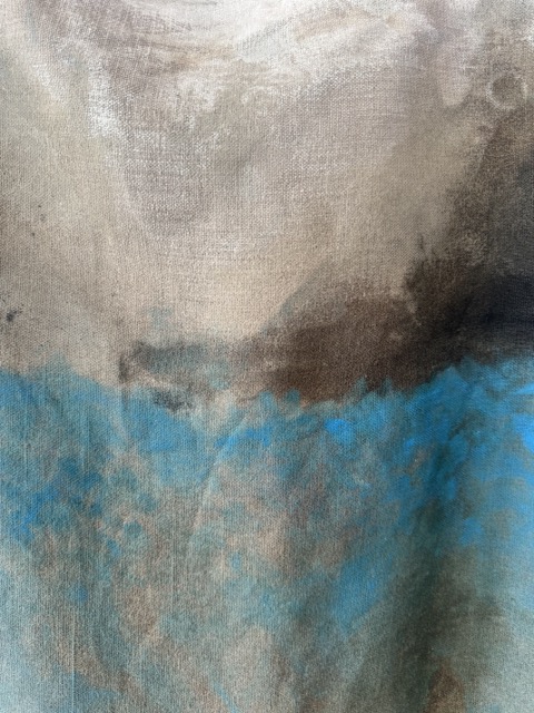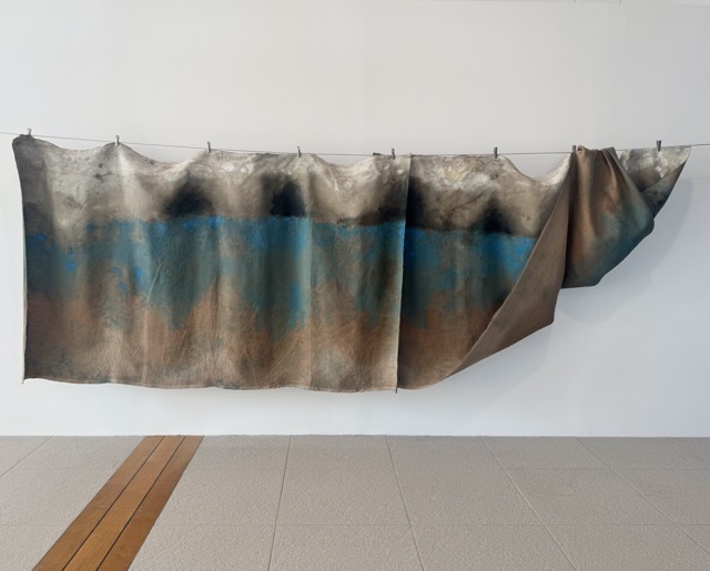 Zwei Bahnen gefärbten Leinens hängen mit Wäscheklammern an einer Leine – auf den ersten Blick schlicht und alltäglich. Doch was wie abstrakte Farbflächen wirkt, stammt vom Händeabtrocknen und Aufwischen im Atelier und besteht aus blauem Pigment, Meudon-Weiß und Asche.