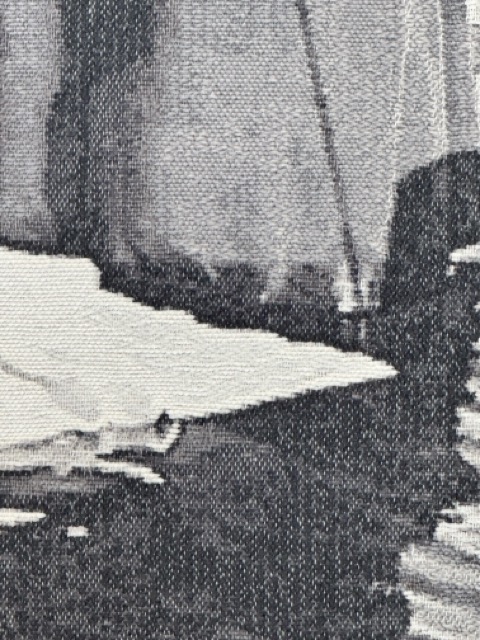 Die Arbeit zeigt die Sinnlosigkeit, die manchmal in unserem Tun liegt und die Ohnmacht, die uns vielleicht in einem solchen Moment überkommt. Gleichzeitig strahlt die Szene eine stille Schönheit aus, die durch die traditionelle Gobelin-Technik und handgestickte Details in ein poetisches Bild verwandelt wird.