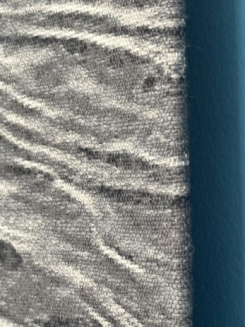 Die französische Künstlerin Emma Perrochon verbindet in Linge des Champs handwerkliche Traditionen mit häuslichen Routinen: Der Leinenstoff wird mit Bleichmittel behandelt, anschließend mit Leinöl, himmelblauem Pigment, Meudon-Weiß – einem klassischen Kreidepigment – und Asche bearbeitet. Das blaue Pigment erinnert an das traditionelle „Bläuen“ von Wäsche und verweist auf historische Pflegemethoden.